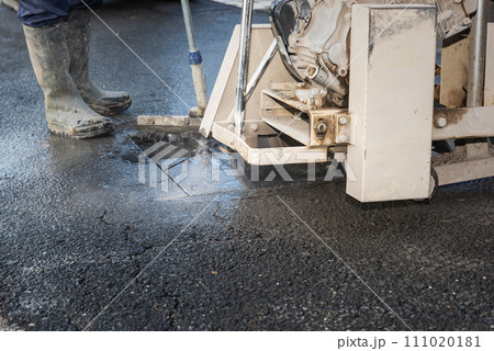 Worker cutting asphalt road