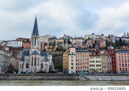 フランス リヨンのソーヌ川沿い街並みとサン・ジョルジュ教会