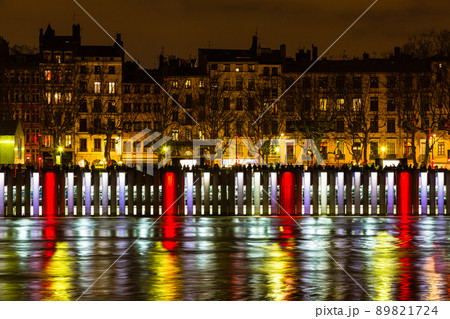 フランス 光の祭典でライトアップされたリヨンのローヌ川沿い街並み
