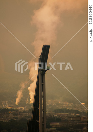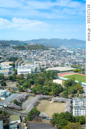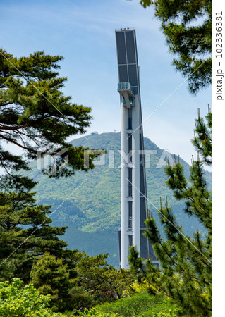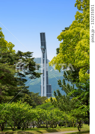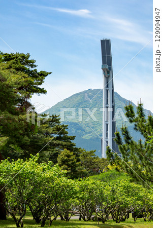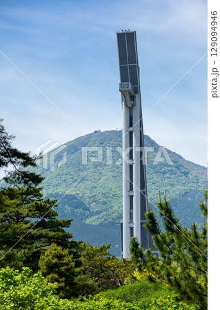 新緑の別府公園から見るグローバルタワーと鶴見岳