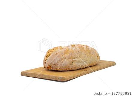 A whole loaf of baked homemade bread lies on a wooden cutting board made of bamboo wood, isolated on a white background with a clipped path with copy space. Blank for artwork, bakery theme