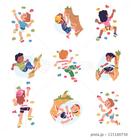 Kids climbing. Children climb on rock wall youth extreme active sport, child mountaineering cartoon kid strength climber effort mount challenge courage, classy vector illustration