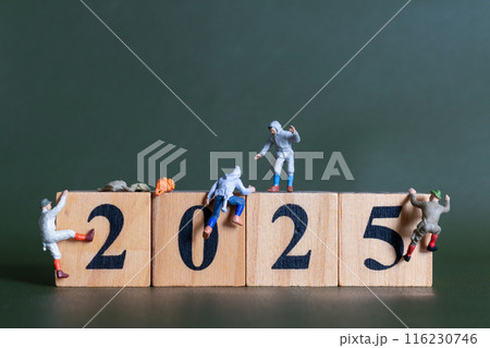 The climber dressed in appropriate climbing gear, on a 2025 wooden block reaching upward with determination