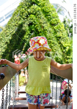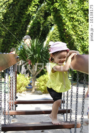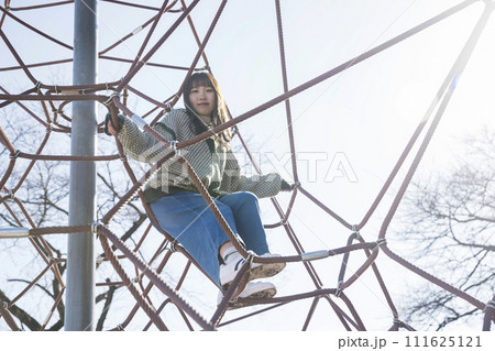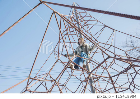 ザイルクライミングで遊ぶ女の子 公園の遊具