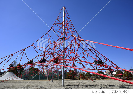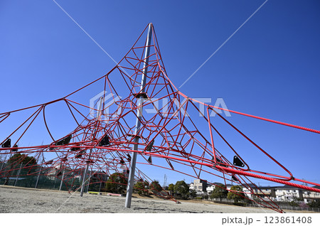 ロープジャングルジム 雲一つない快晴の青空を背景に 横位置