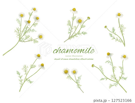 水彩で描いたカモミールの花とナチュラルなカットイラストセット