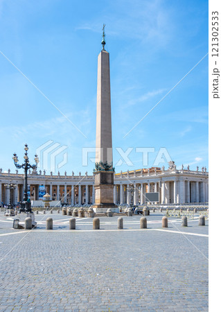 The Egyptian obelisk rises prominently in the center of Saint Peter's Square, surrounded by historic architecture. Visitors admire the majestic landmark under a clear blue sky.