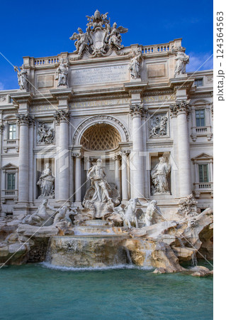 Tourists gather near the Trevi Fountain in Rome, marveling at its detailed sculptures and grand design under a clear blue sky, enjoying the vibrant atmosphere and historical significance.