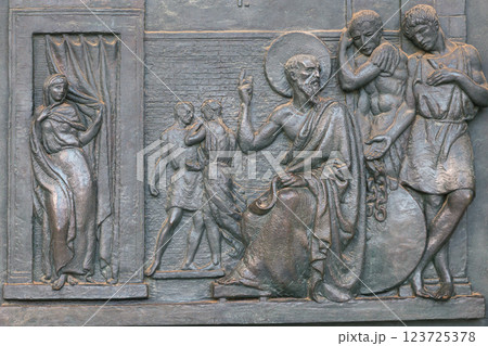 Roman ruins (carved on white background) in the Jordanian city of Jerash (Gerasa of Antiquity), capital and largest city of Jerash Governorate, Jordan