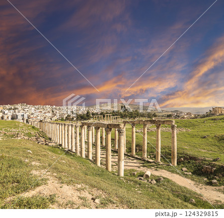 Roman ruins (against the background of a beautiful sky with clouds) in the Jordanian city of Jerash (Gerasa of Antiquity), capital and largest city of Jerash Governorate, Jordan