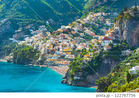 Morning view of Positano cityscape on coast line of mediterranean sea, Italy