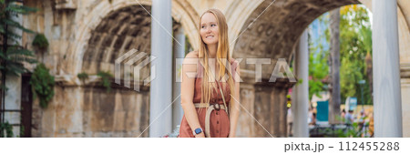 BANNER, LONG FORMAT Happy female tourist traveler discover interesting places and popular attractions and walks in the old city of Antalya. Hadrian Kapisi turkey landmark city history. Popular tourist