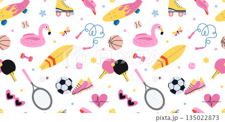Seamless pattern with summer sport, surfing, skating, tennis and beach activities. Bright background for active lifestyle and recreation themes. Trendy vector illustration, hand drawn, flat design