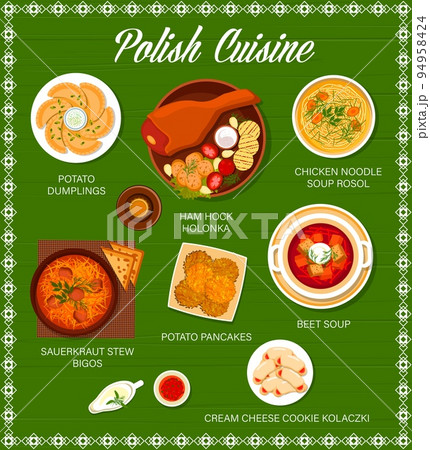 Polish cuisine vector menu with vegetable and meat food dishes. Chicken noodle soup, potato dumplings pierogi and pancakes, bigos stew with sauerkraut, baked ham, beet borscht and cream cheese cookies