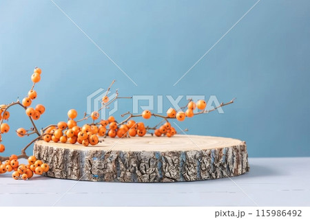 Wood podium saw cut of tree on blue background with autumn rowan berries. Concept scene stage showcase, product, promotion sale, presentation, beauty cosmetic. Wooden stand studio empty