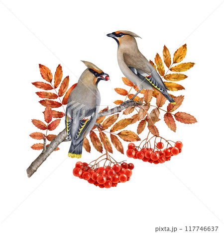 Waxwing birds on autumn season rowan tree branch with red berries. Vintage style forest birds watercolor illustration. Wildlife nature waxwing bird couple on rowan twig isolated on white background
