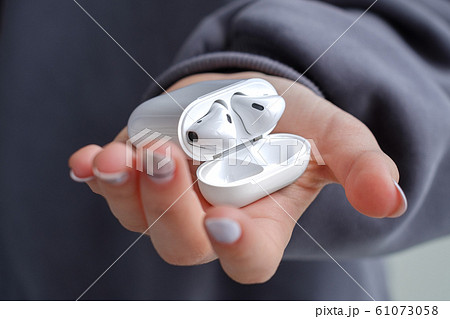 White charging case for airpods in a female hand. Wireless headphones in an open case in a man's hand.
