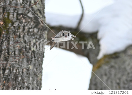 北海道の冬の公園で日中に雪の積もった木々の間を空を飛ぶ(跳ぶ)エゾモモンガ