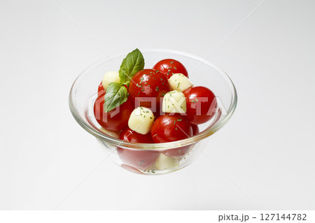 ガラスの器に盛り付けたプチトマトのカプレーゼ