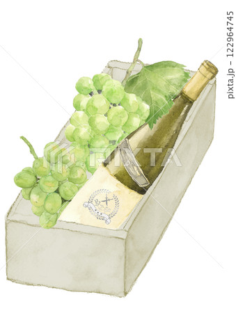 水彩で描いたぶどうと白ワインボトルの箱詰めセットのイラスト【手描き】白バック 透過背景