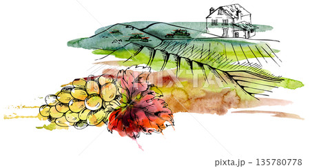 Calm countryside scene with rolling hills, farmland areas, rural house, grape cluster and leaf closeup. Watercolor and ink isolated illustration for farmers market ads, food and wine produce packaging
