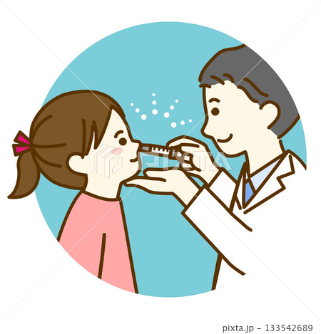 点鼻ワクチンを接種する子供と男性医師 丸背景