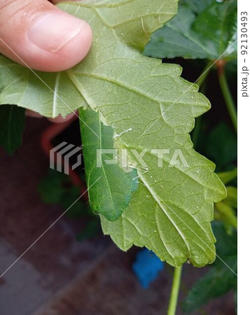 ワタノメイガ幼虫の被害を受けたオクラの葉