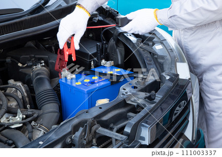 車のバッテリーのトラブル(ワニ口クリップを持つ整備士)