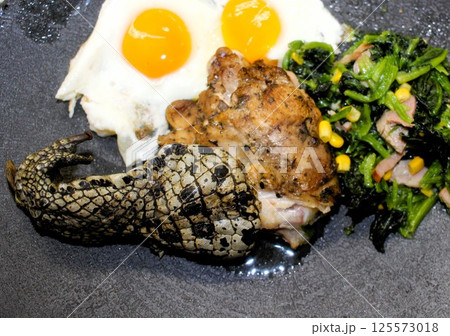 Modern barbecue crocodile tail eye fillet with roasted sweet potatoes pineapples