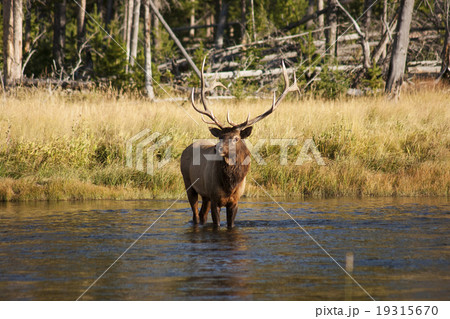 川を渡る鹿 エルク ワピチ イエローストーン国立公園