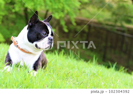ゆずの里毛呂山町総合公園の緑の芝生に座って見つめるボストンテリアのマイティ君♡