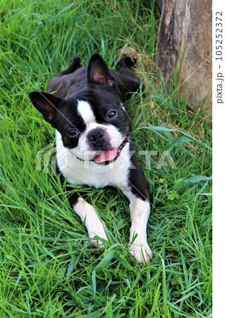 綺麗な新緑の下で芝生に伏せて可愛く見つめるボストンテリアのマイティ君♡