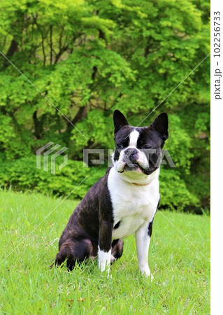 爽やかな新緑の下で芝生に伏せて里山を見つめるボストンテリアのマイティ君♡