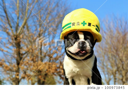 青空の下で黄色い安全第一ヘルメットを被って見つめるボストンテリアのマイティくん