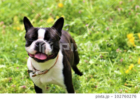 タンポポが咲く野原で可愛く見つめる笑顔のボストンテリア♡マイティくん