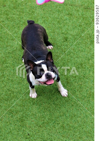 埼玉県坂戸市のドックランで楽しく遊びながら可愛く見つめるボストンテリアのマイティくん♡