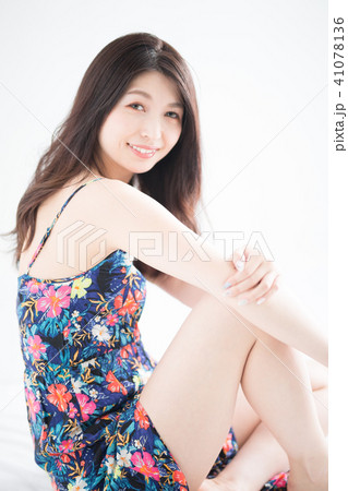 畳の上に座りくつろぐ白いキャミソール姿の若い女性