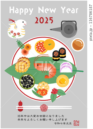 2025年巳年の年賀状 おしゃれなワンプレートおせち料理のイラスト