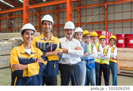 Group of male and female factory labor stand smiling together with arms crossed in industry factory. Everyone wearing safety uniform and helmet. Workers working in the metal sheet factory.