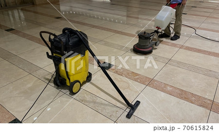 Marble floor polishing with a professional floor scrubber and wet vacuum cleaner in office building lobby