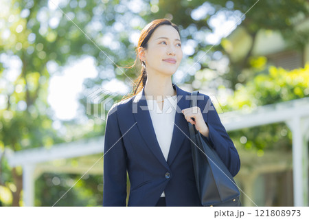 オフィス街の木陰を歩くビジネスウーマン 後ろ姿