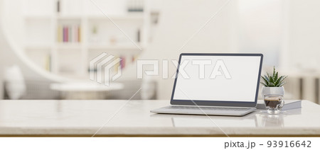 Laptop mockup and copy space on modern white workspace tabletop over blurred library