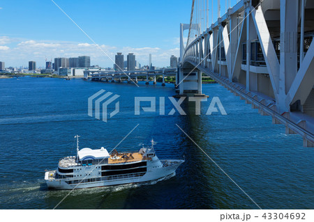 レインボーブリッジを通過する東京湾クルーズ ・ヴァンテアンと青空