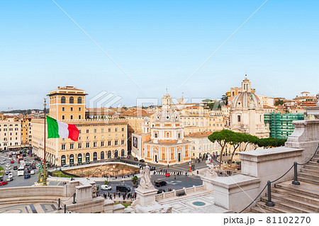秋晴れの空にイタリア国旗 ヴィットリオ・エマヌエーレ2世記念堂