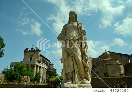 火の神ヴェスタを祀る神殿の巫女像、後方はアントニウスとファウスティーナの神殿とロムルスの神殿(右)