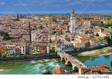 イタリア、ヴェローナ、ランベルティの塔からの眺め、ヴェローナ市街、アディジェ川