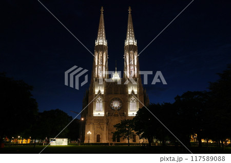 中央ヨーロッパのオーストリア 世界文化遺産ウィーン歴史地区 ライトアップされたヴォティーフ教会夜景