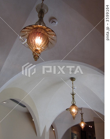 ヴォールト天井の廊下とヴェネチアングラスの照明