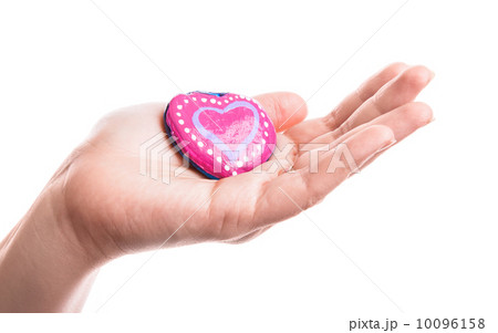 Pink painted handmade heart shaped stone in woman's hand isolated on white