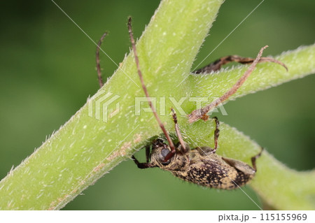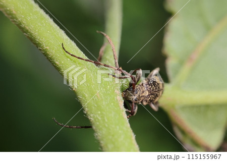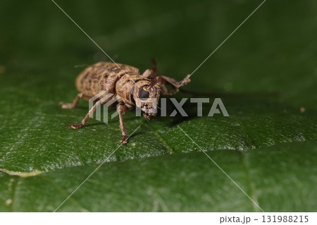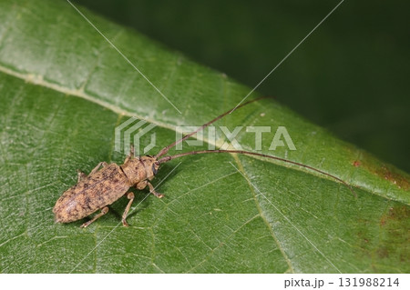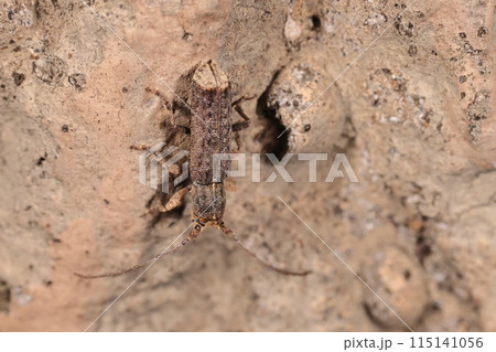 生き物 昆虫 シモフリナガヒゲカミキリ、細かい毛に覆われた体は薄茶色に黒いまだらの斑点模様